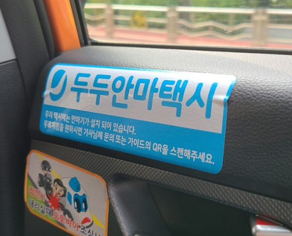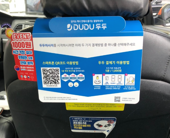 이런 안마의자였다면 더할나위 없겠지만 차량용 안마의자는 기존에 존재해 왔었죠. 그런데 택시에서 안마의자를 만난 것은 처음이었습니다. 최근 택시를 자주 타고 다녔는데 차량용 안마의자가 설치된 택시는 처음이었거든요. 요즘엔 보통 뒷자석에 많이 타는데 평소와는 다르게 조수석 뒤쪽으로 처음보는 설명과 함께 QR코드가 찍힌 안내문이 붙어있었습니다. 자세히 보니 두두안마택시 사용법에 대한 설명이었고, 뒷자석 창문 하단에는 '두두안마택시'라는 스티커도 붙어있었습니다. 인터넷에서 찾아보니 '두두케어택시마사지'라고 홈페이지도 있네요.