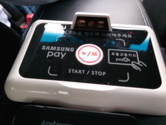 뒷자석에서 택시요금 결제를 할 때 보통 가운데 짐 놓는 공간에 결제기가 부착되어 있는 경우가 많은데 두두안마택시같은 경우에는 안마의자 이용과 결제를 위한 기기가 하나 더 부착되어 있습니다. 즉 짐칸 앞쪽에는 택시안마 동작기가 있고 그 바로 뒤에 요금결제를 위한 결제기가 달려있어요. 사용법은 아래 그림에 나오는 동그란 시작버튼을 누르고 택시요금 결제하듯이 결제를 하면 됩니다. 안마세기도 선택할 수 있구요.