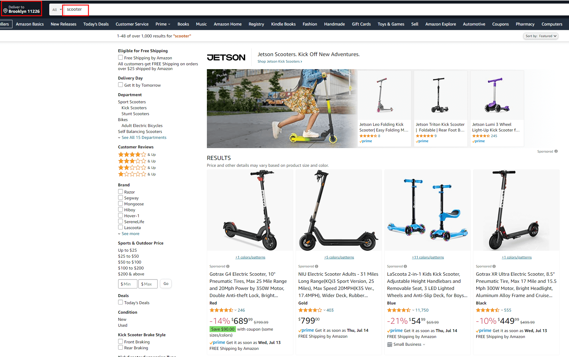 미국에서 가장 유명한 오픈마켓인 아마존에 접속해서 직접 확인해봤습니다. 지역을 미국으로 바꾸고 검색창에 영어로 'kickboard'를 치면 아래와 상품이 가장 먼저 나옵니다.
