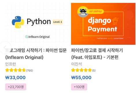 인프런도 프로그래밍, 마케팅 등 자기계발과 관련한 다양한 강의를 제공합니다. 파이썬을 비롯한 다양한 분야의 프로그래밍 강의도 있으니, 한 번 둘러보시길 추천드립니다.