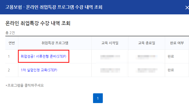 여기서 본인이 들었던 강의를 선택하시면 구직활동 1건으로 인정받으실 수 있습니다. 저는 제가 들었던 취업성공! 서류전형 준비(STEP)이 목록에 나와있네요.